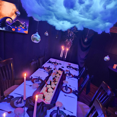 This birthday tea party brought Tim Burton’s beloved world to life, blending spooky charm with elegant afternoon tea. Guests were welcomed into a setting inspired by Halloween Town, complete with moody florals, striped accents, and playful nods to Jack, Sally, and friends. The table featured themed treats and cocktails that balanced the eerie and the sweet—perfect for a celebration that lives between two holidays.