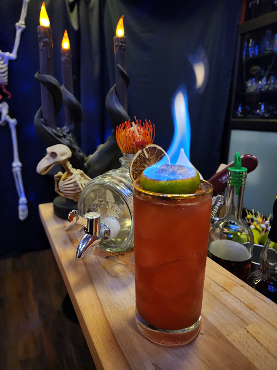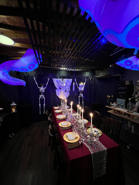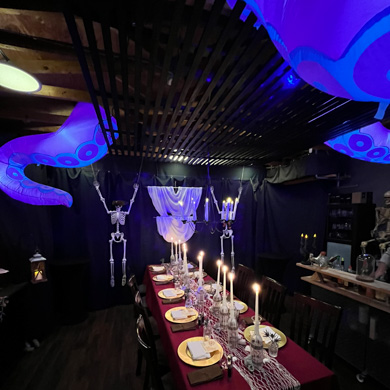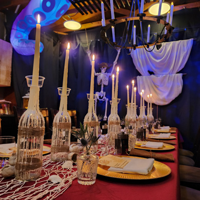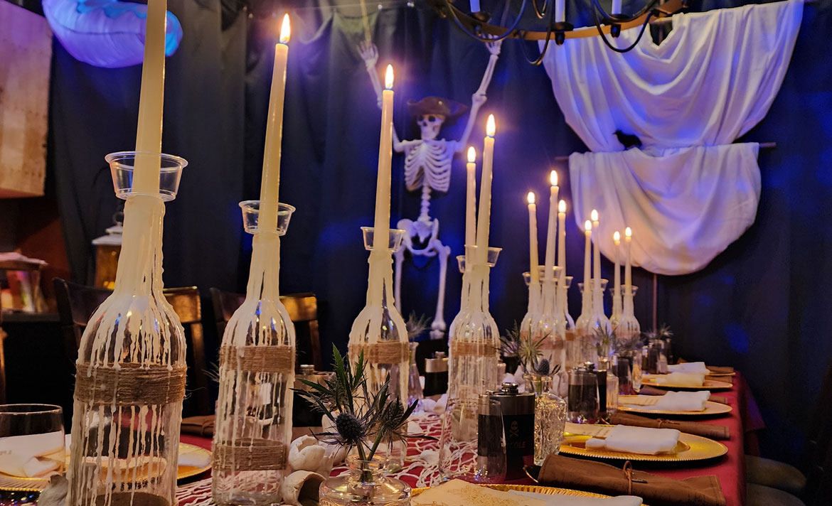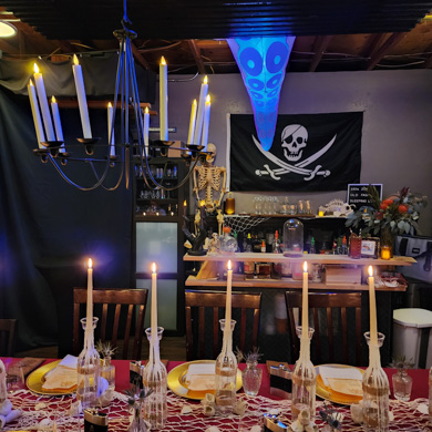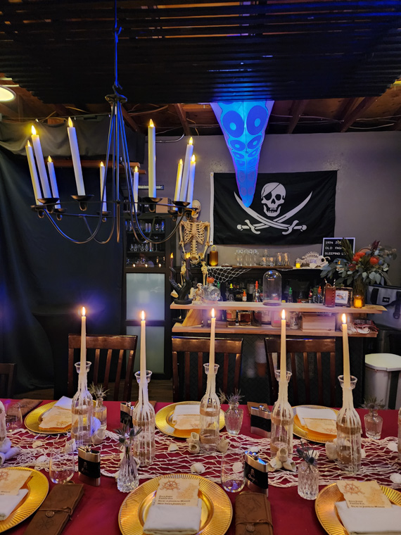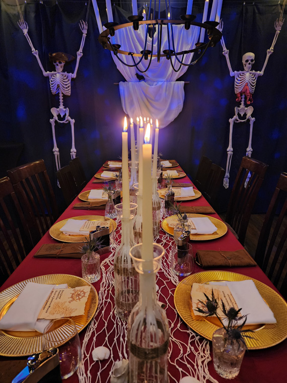 This Halloween dinner set sail on a high-seas adventure, transforming the space into a candlelit pirate ship filled with weathered wood, lantern light, and seafaring intrigue. Guests arrived in pirate attire and received customized flasks as part of their character roles in a murder mystery set aboard the cursed vessel. Between bites of hearty fare and sips of spiced cocktails, they uncovered secrets, accused scallywags, and navigated twists in the tale. With immersive décor, interactive storytelling, and a touch of treachery, the night was a swashbuckling celebration to remember.